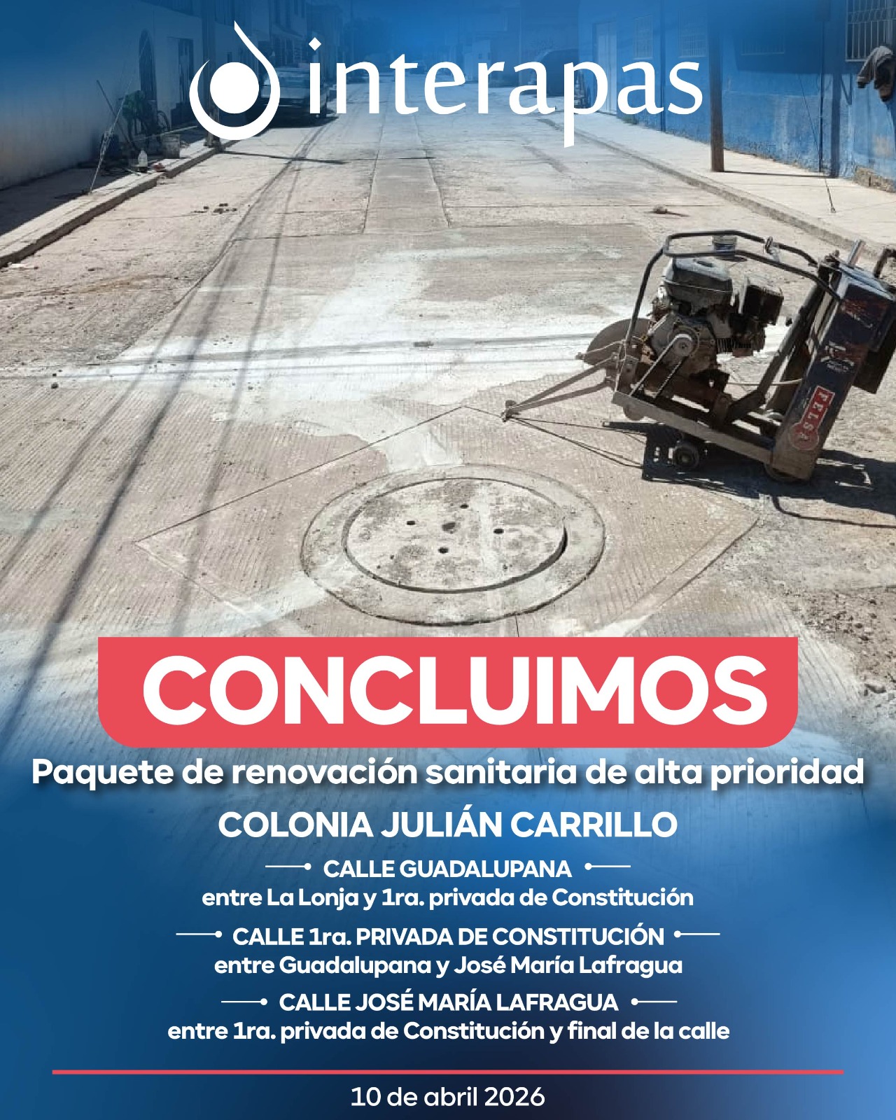 Interapas concluye rehabilitación sanitaria en circuito de calles de Julián Carrillo