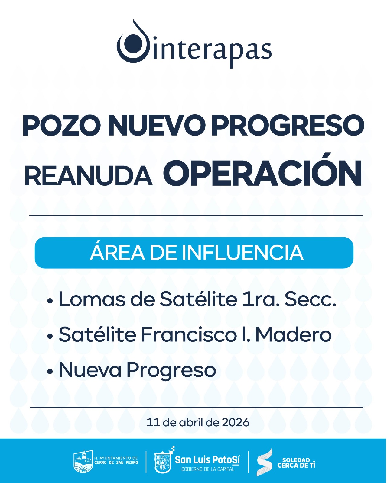 Interapas continuará con el monitoreo de esta fuente de abastecimiento para asegurar su correcto funcionamiento. Para reportes o mayor información, la ciudadanía puede comunicarse a la línea Acuatel 444 123 64 00.