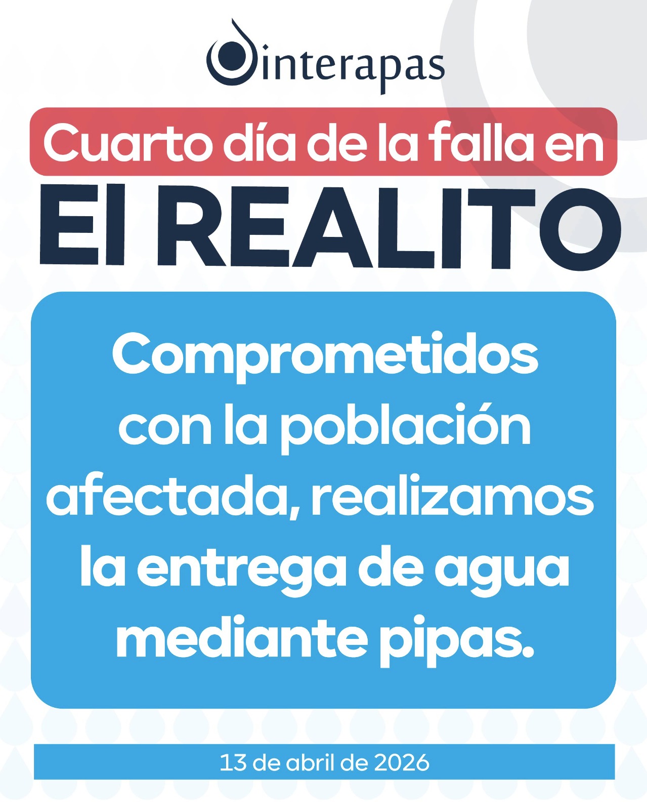 Cuarto día sin suministro de “El Realito”; se acumulan 20 días sin servicio en 2026